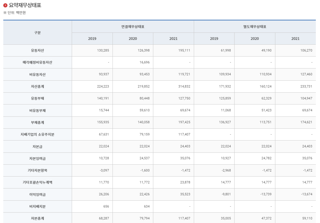 위 금양 요약 재무상태표에서 연결재무상태표를 보면 자본총계가 2019년도에는 68,287백만 원 2020년도에는 79,794백만 원 2021년도에는 117,407백만 원으로 증가하는 것을 볼 수 있다.