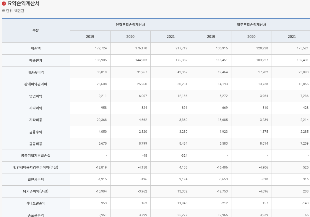 위 금양 요약 손익계산서에서 연결 포괄손익계산서를 보면 총 포괄손익이 2021년에는 흑자로 전환된 것을 볼 수 있다.