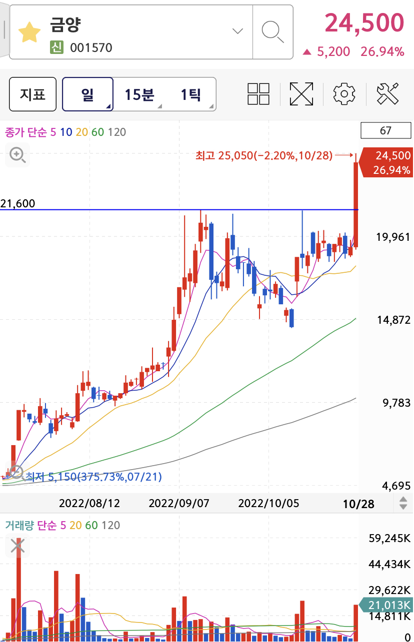 2022년 9월 8일 (목)부터 저항으로 작용했던 가격대 21,250원~21,600원을 거래대금 약 4900억 원을 동반하며 돌파했다. 금양의 시총은 2022년 10월 28일 (금) 기준 1조 4,222억 정도 된다. 유동주식 수는 29,240,000주이며 유동비율은 50.37%이다.
