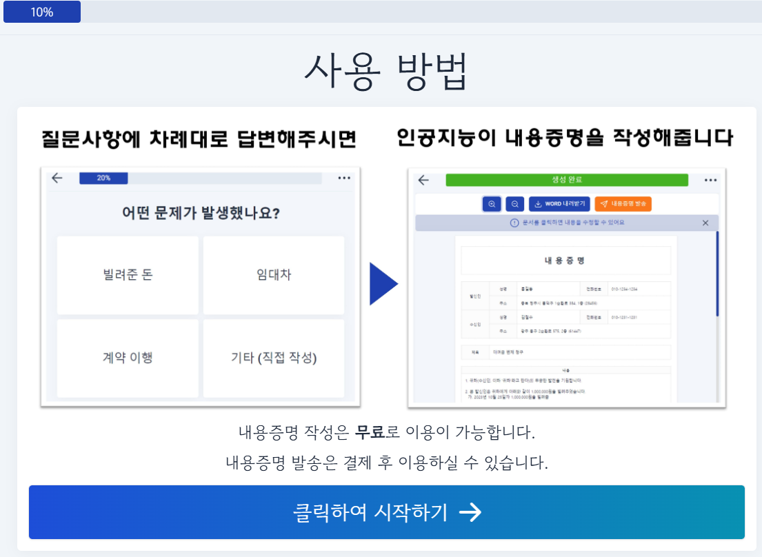 내용증명을 직접쓰기 어려우시다면 아래 버튼 눌러서 1분 무료 내용증명 작성해보시길 바랍니다.
