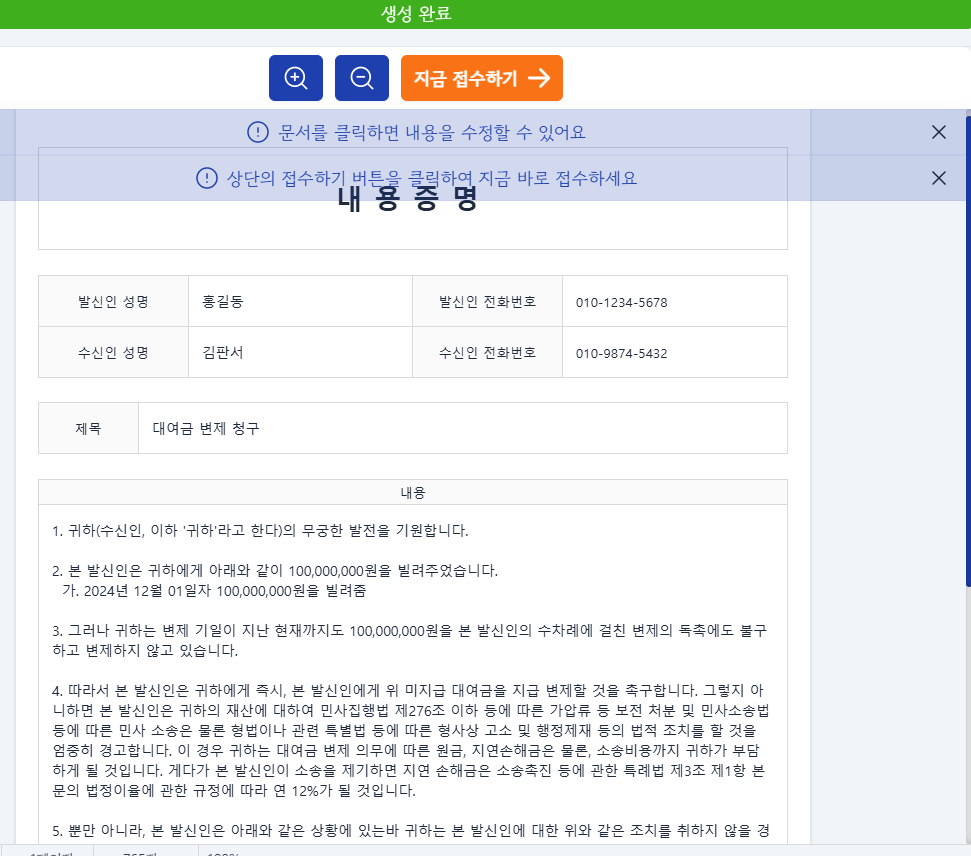 - 비용 지불 : 내용증명 서비스의 발송 비용을 지불합니다. 비용은 일반 우편보다 다소 비쌀 수 있습니다.
