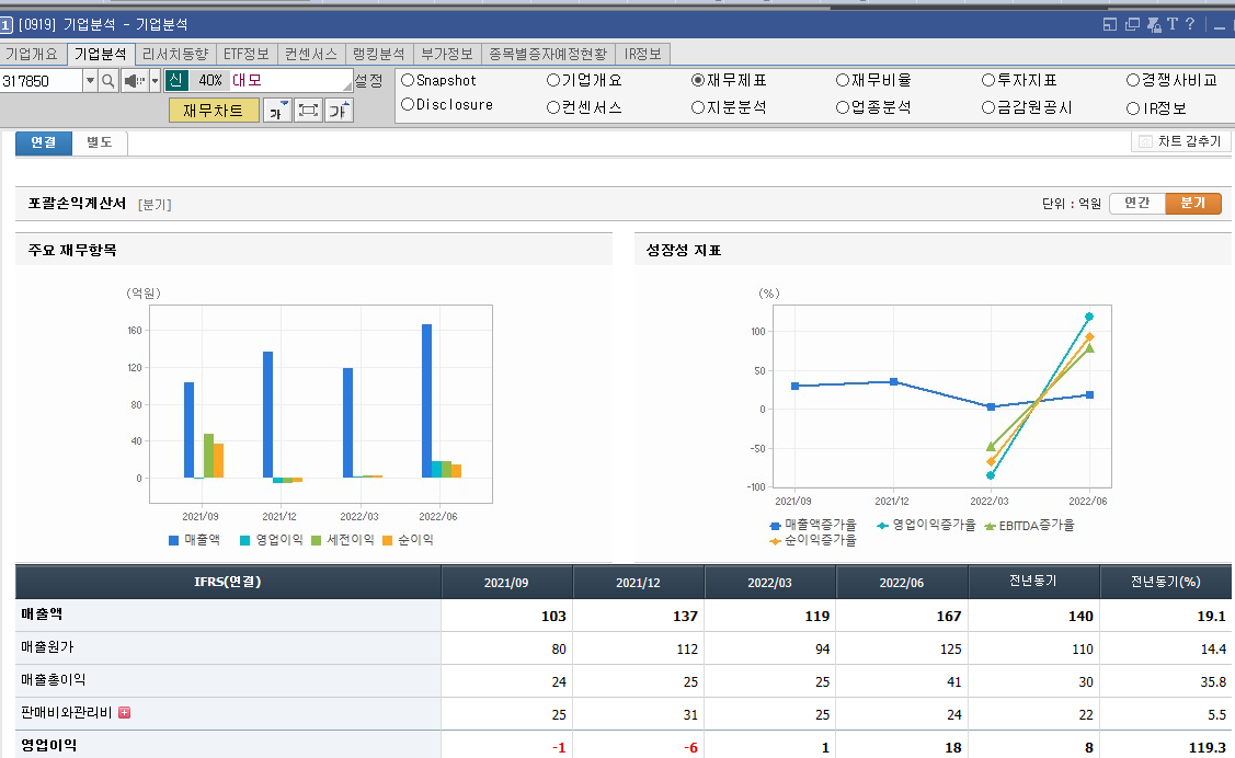 위 대모 분기 재무제표를 보면 2022년 6월 전년 동기 대비 연결기준 매출액은 19.1% 증가, 영업이익은 119.3% 증가한 것을 볼 수 있습니다. 3,000억 원의 매출을 달성하려는 중장기 목표를 가지고 있는 회사로 앞으로의 꾸준한 성장을 기대해 볼 수 있겠습니다.