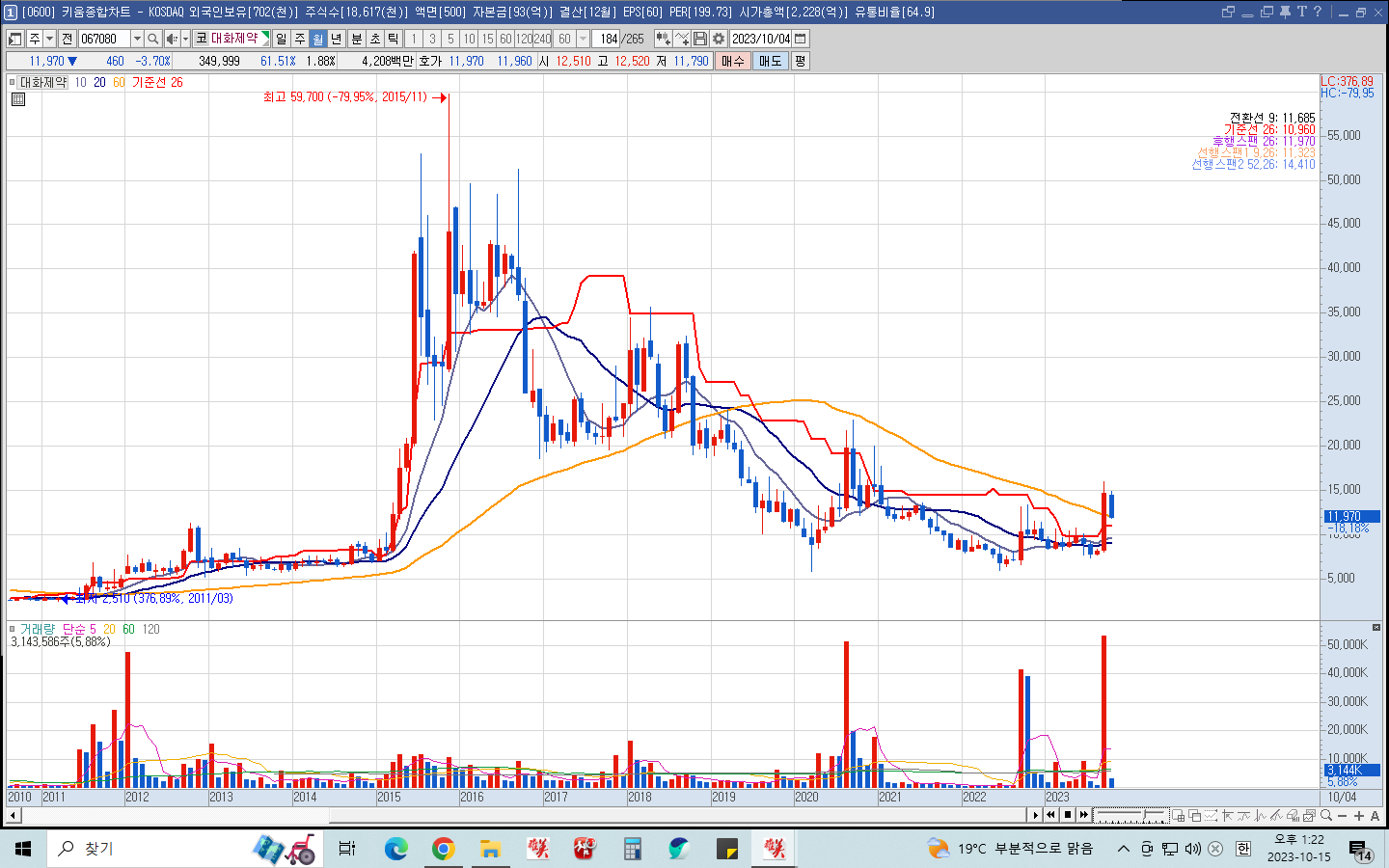 아래 대화제약의 월봉 차트를 보면 60선을 돌파하는 기준봉이 발생했다.