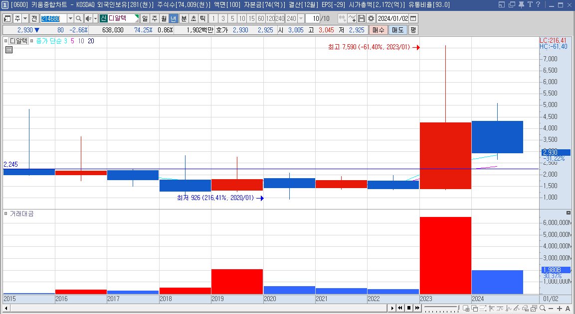 우선 디알텍의 연봉 차트를 보면 2023년 2,245원 매물대를 첫 돌파하는 연봉 기준봉이 발했습니다. 연봉의 거래대금은 약 6조 5천억 원입니다.