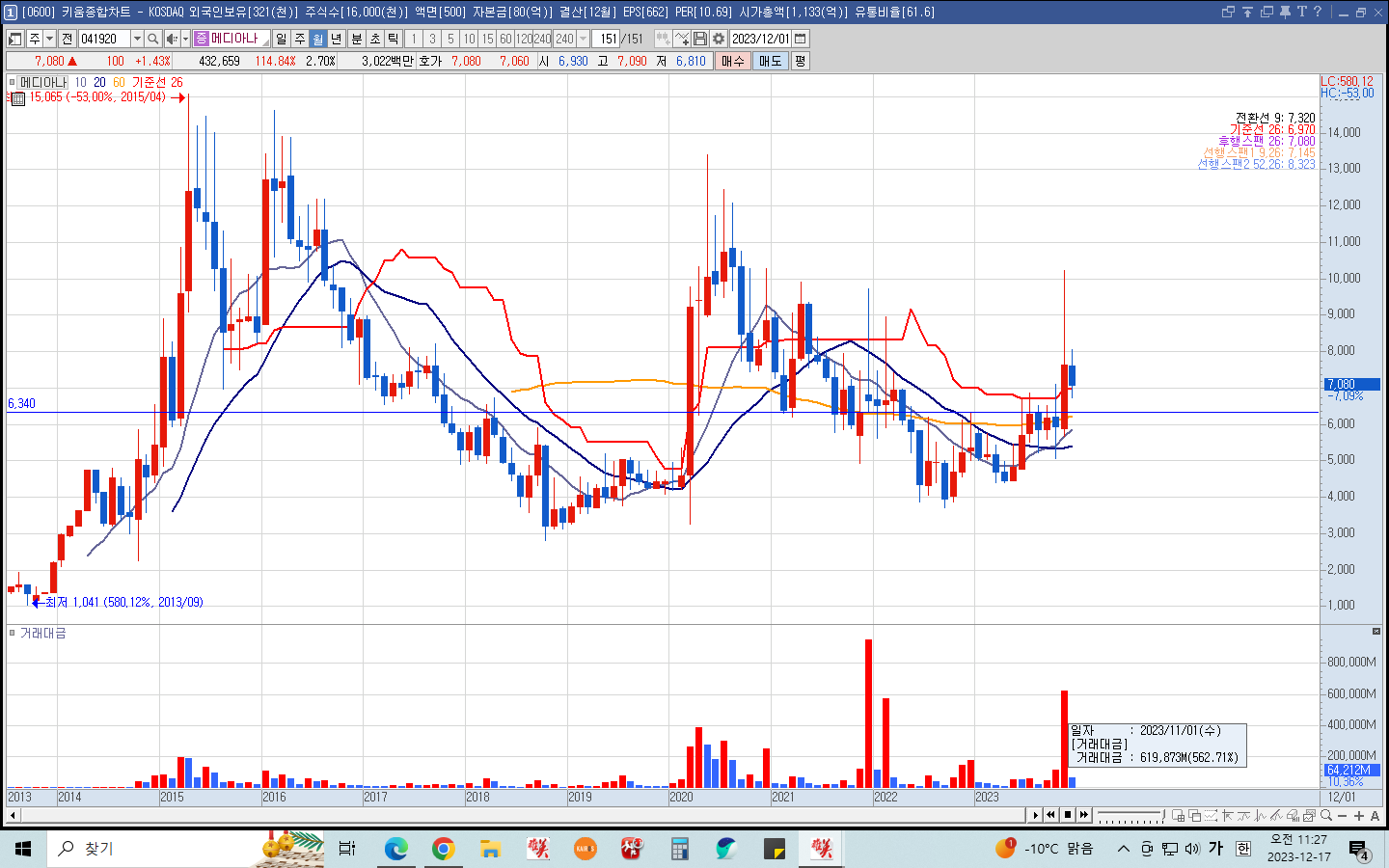 아래 메디아나의 월봉 차트를 보면 2023년 11월 거래대금 약 6,500억 원을 동반해서 전고점 매물대를 돌파했다. 그 이후 약 한 달간 조정을 받고 있다.