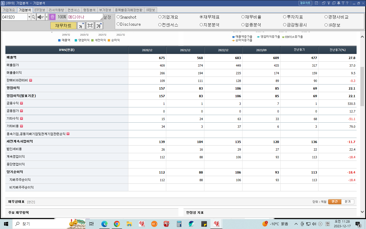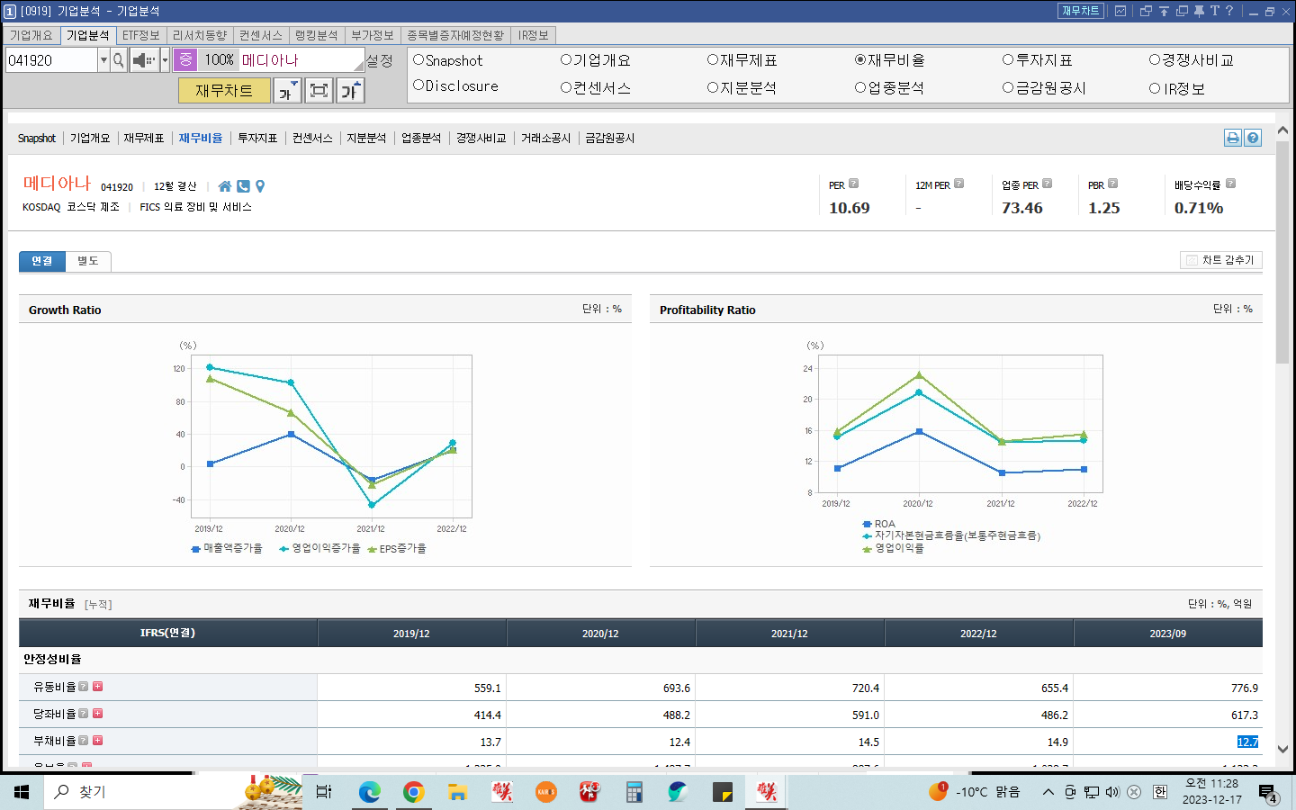 아래 사진을 보면 메디아나는 부채비율, PBR(주가 순자산비율), PER(주가 수익비율), 매출액 및 당기순이익 모두 안정적인 수치를 보여주고 있다.