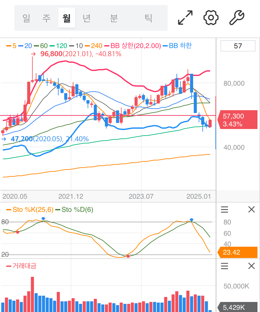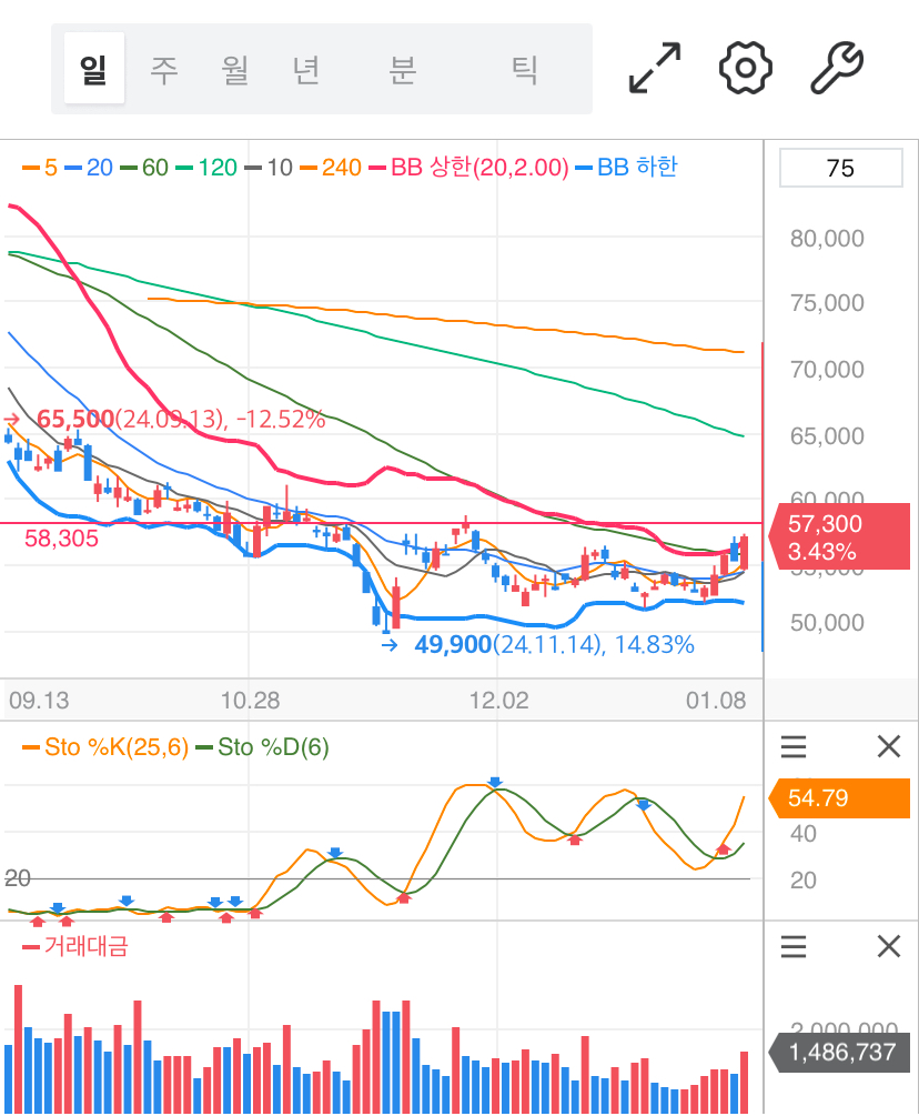 삼성전자의 주가 차트를 살펴보면, 최근 몇 달간 하랃 하다가 바닥을 잡고 이제 상승을 하려고 하는 것 같급니다. 특히 2025년 1월 3일 외국인 매수 이후 오늘 다시 외국인이 매수 한 것을 확인 할 수 있습니다. 차트 분석을 통해 단기적인 조정이 있을 수 있지만, 중장기적으로는 상승세가 지속될 가능성이 높습니다.
