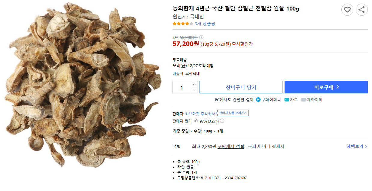 두릅나무과의 삼칠의 뿌리를 말합니다. 금불환이라고도 불리며, 금과도 바꿀 수 없는 귀중한 약재로 알려져 있습니다. 생김새는 원추형으로 근두부에 줄기에 붙었던 자국이 있고 주위에는 작은 혹모양의 돌기가 있습니다. 바깥 면은 회갈색 또는 회황색이며 세로주름과 가는 뿌리가 붙었던 자국이 있습니다. 절단면은 흑갈색으로 방사상의 무늬가 나타나며 질은 무겁고 단단합니다.