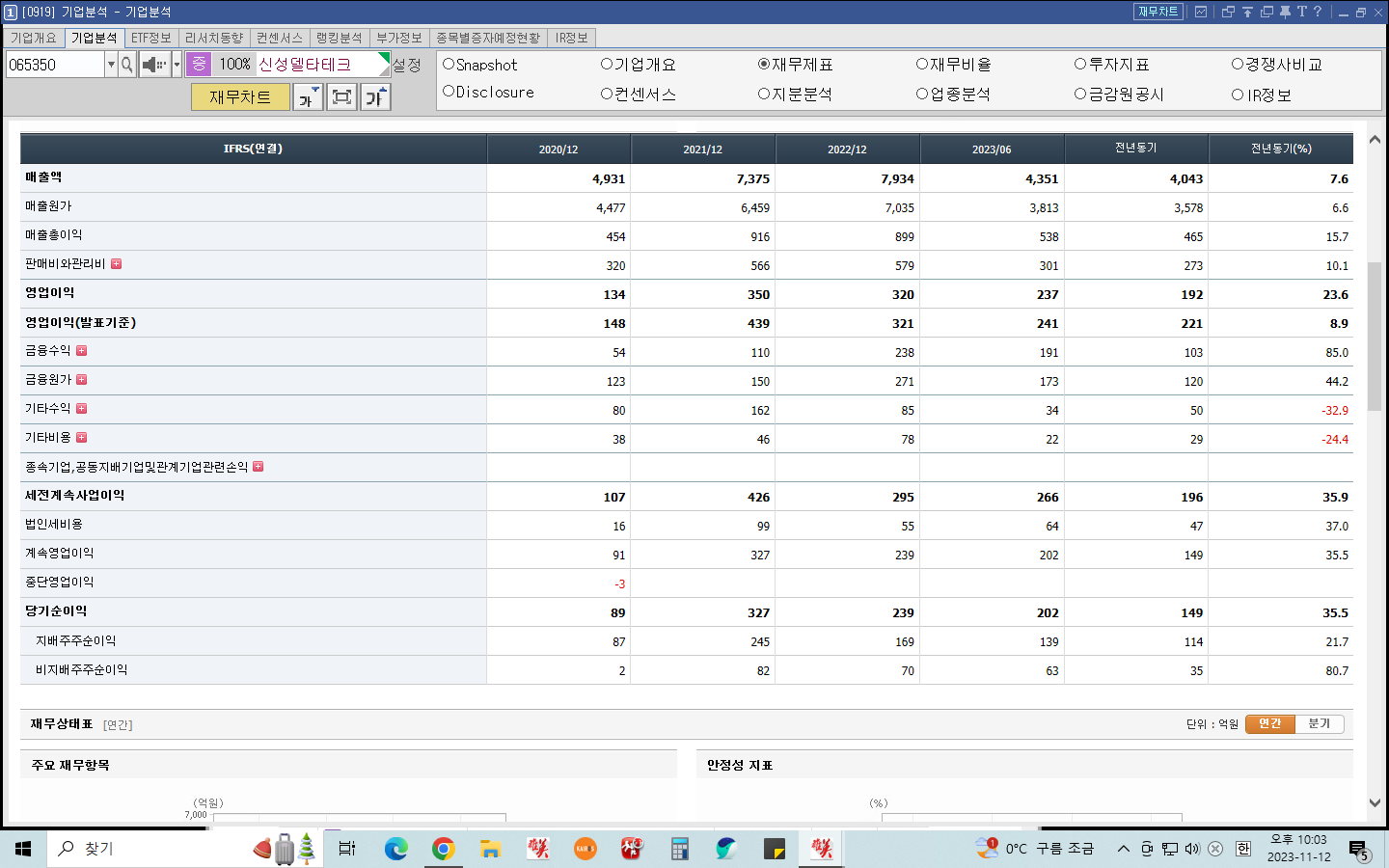 아래 사진을 보면 PBR(주가 순자산비율), PER(주가 수익비율) 높은 걸 볼 수 있다. 그만큼 기업의 순자산이나 당기순이익에 비해 시가총액이 높은 다는 것을 보여준다. 또한 부채비율도 182%로 높은 편이다.