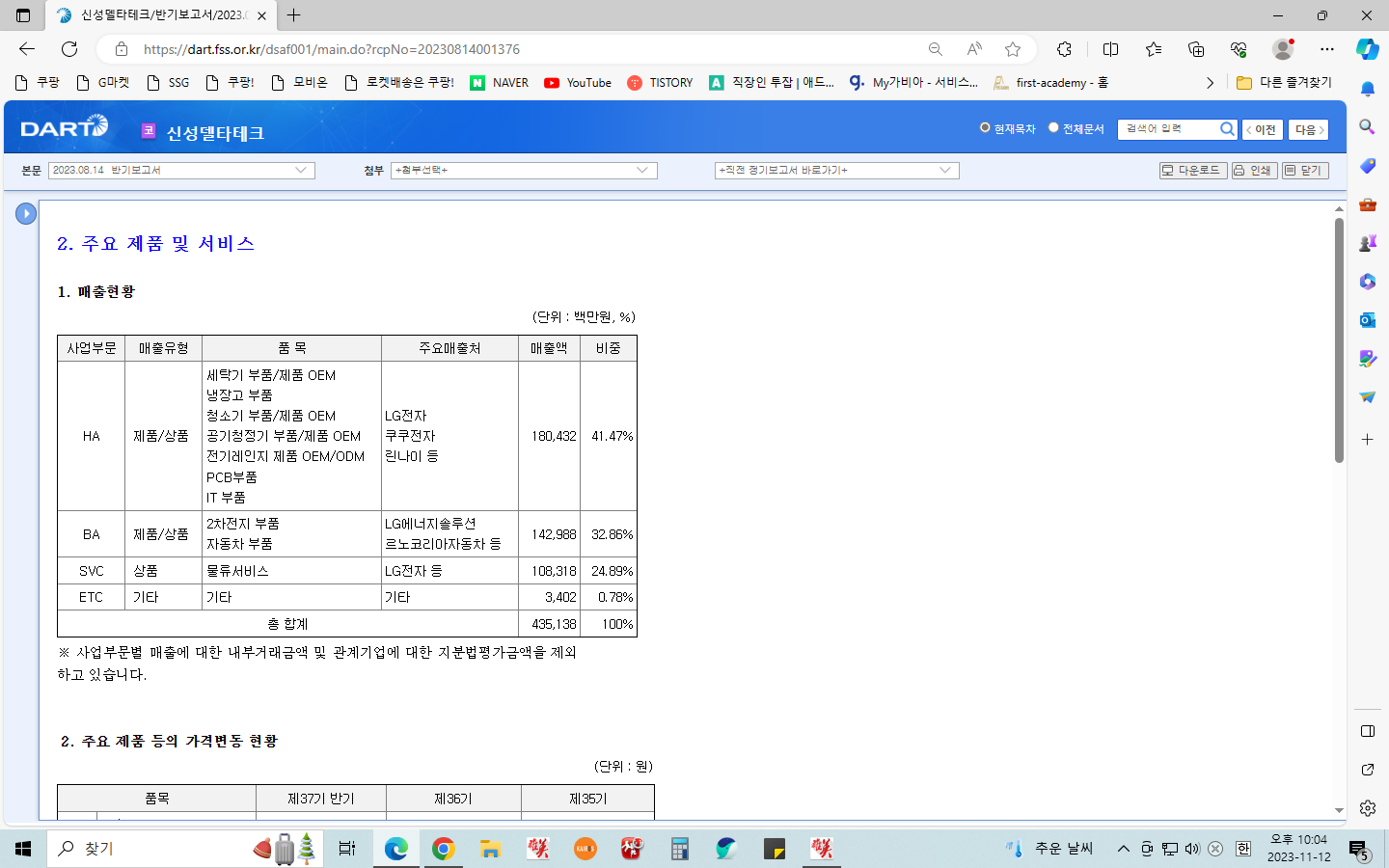 신성델타테크는 사업의 계속성 등을 고려하여 경영의 다각화 실태를 적절히 반영할 수 있도록 HA(생활가전), BA(2차 전지), SVC(물류서비스) 3개의 사업부문으로 구분하고 있다. HA(생활가전)사업부문은 세탁기, 건조기, 냉장고, 청소기 등 생활가전 부품을 생산하고 있으며, 고객사로부터 기술력을 인정받아 프리미엄 핸디형 청소기 및 로봇청소기 등을 OEM 생산하고 있다. 기존 부품사업의 원가절감 및 OEM/ODM 비중확대를 통해 수익성 극대화에 노력하고 있다. BA(2차전지)사업부문은 셀 카트리지, 리프팅프레임, 방열판, 부스바 등 전기차 및 ESS에서 사용되는 부품을 생산하고 있으며 중국, 폴란드를 주요 글로벌 거점으로 기술 및 생산성 향상을 지속 추진하고 있다. SVC(물류서비스)사업부문은 재료나 제품 등의 운송ㆍ보관ㆍ하역 등과 이에 부가되어 가치를 창출하는 가공ㆍ조립ㆍ포장 등과 관련된 사업을 진행하고 있으며, 글로벌 운송 물량 증가에 따라 성장세를 이어가고 있다. 또한 신규 성장 동력으로 미국법인 VMI(공급자 주도형 재고관리) 사업을 준비하고 있다. 아래 사진은 주요 제품 및 서비스의 매출 현황이다.