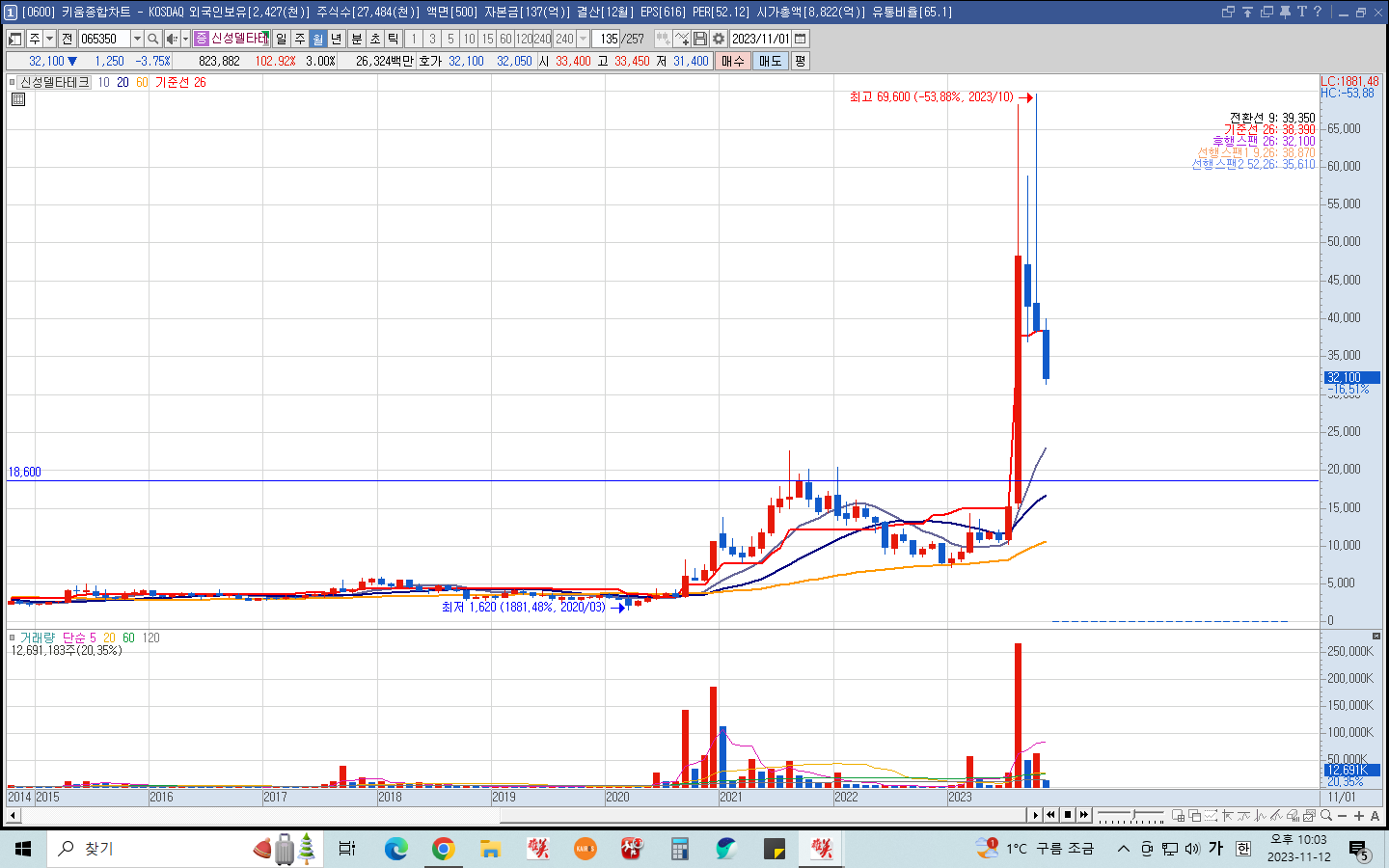 1차 매수는 32,000원대에서 하고 2차 매수는 일봉 종가가 32,000원 이하 일 때 한다. 매수한 평균 단가에서 15% 수익에 자동 매도 걸어 놓는다. 비중은 항상 강조하지만 10% 미만으로 설정하고 그 1/10 비중안에서 분할로 매수한다. 신성델타테크는 조정을 많이 받았다 하더라도 현재도 시총이 높기 때문에 단기매매로 접근한다. 물론 어떠 이슈로 인해서 더 크게 상승할 수도 있다. 하지만 그건 내 것이 아니라고 생각하고 아쉬워하지 말아야 하며 욕심이 생겨서 매매할 주가가 아닌데 매수해서 수익 난 것을 그대로 잃어버리는 행동을 하지 말이야 한다.