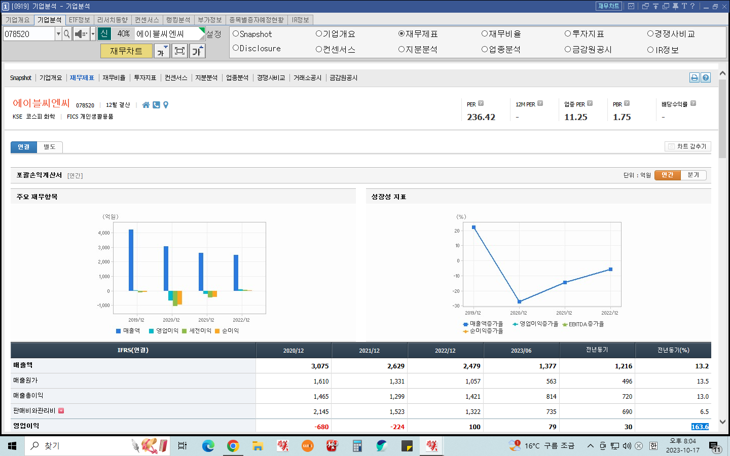 아래 재무제표에서 볼 수 있듯이 2023년 영업이익이 79억으로 전년동기 30억 보다 약 164% 증가했다. 하지만 2017년 중국의 사드(THAAD) 보복 영향과 로드숍 업계 불황 등으로 부진한 실적이 지속됐다. 2017년부터 지난해까지 누적 순손실이 1530억원에 달한다.