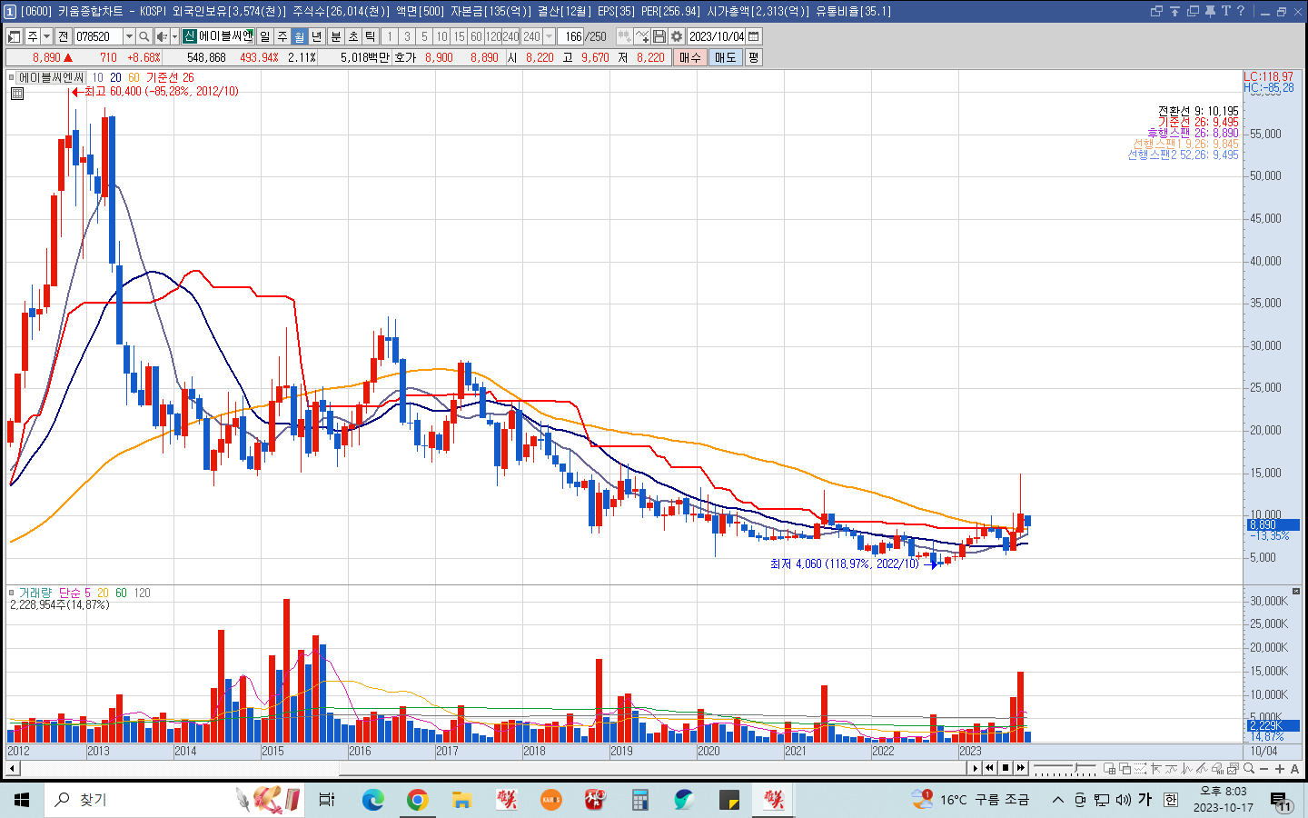 에이블씨엔씨 월봉을 보면 2017년 5월부터 2023년 8월까지 60선을 돌파하지 못하다가 23년 9월에 첫 돌파를 했다. 그 이후 조정을 받고 있다.