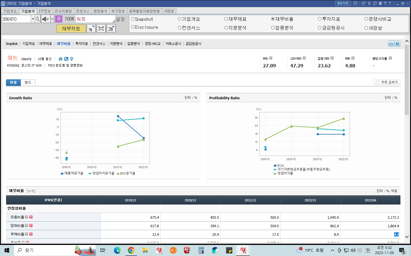 아래 사진에서 워트의 PBR(주가 순자산비율)과 PER(주가 수익비율)을 보면 시가총액 대비 기업의 순자산과 당기순이익이 낮은 걸 알 수 있다.