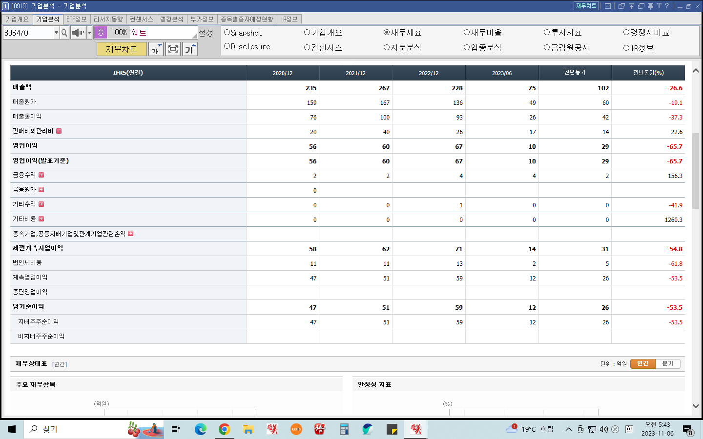 아래 워트의 재무제표를 보면 2023년 반기 매출액은 75억 원으로 전년동기 -26.6%인 것을 확인할 수 있다.