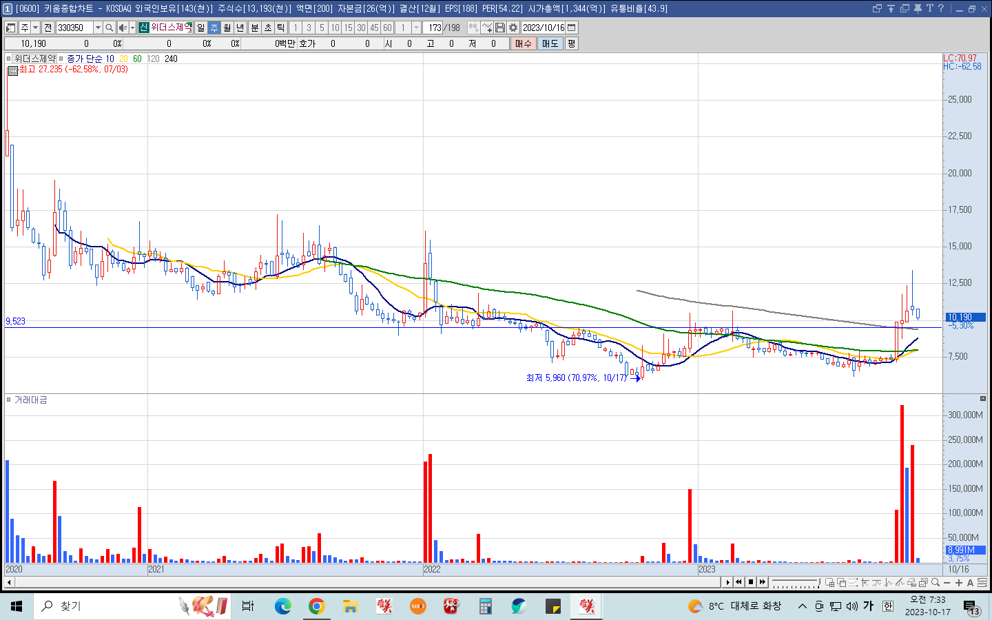 위더스제약의 유동주식은 약 580만 밖에 안된다. 그렇기 때문에 변동성이 심하다. 매수 이후 반드시 목표가에 자동 매도를 등록해놔야 한다. 물론 매도가 보다 주가가 더 올라갈 수 있다. 중장기 투자를 해도 좋을 것 같은 회사지만 회사에 대한 좀 더 자세한 정보가 없다면 적당한 수익에 만족해야 한다. 또 다른 종목을 발굴하면 그만이다. 1차 매수 10,290원 아래서 매수, 2차 매수 9,550 아래서 매수 후 10% 수익 발생 시 매도한다. 2차 매수 후 10일 영업일 안에 수익이 발생하지 않을 시 손절한다. 종목을 매수할 때는 투자금의 10% 미만으로 해야 한다. 그 종목에 투자금이 할당되면 그것 또한 분할로 매수해야 한다. 그래야만 한 종목에서 손실이 나도 큰 손실 없이 계속해서 투자를 이어나갈 수 있다. 어떤 종목이 좋아 보인다고 해서 몰빵투자를 하게 되면 손실이 났을 때 멘틀이 나가서 뇌동매매로 이어진다. 그렇기 때문에 반드시 분할로 투자하며 차트, 재료, 기업, 시장을 공부하면서 실력을 키워나가야 한다.
