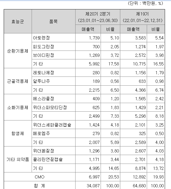 위더스제약의 제품을 크게 분류하면 순환기용제, 근골격용제, 소화기관용제, 항생제, 중추신경용제, 호흡기관용제, 피부용제, 내분비용제, 화학요법제, 비뇨생식기관용제, 항바이러스제, 부신호르몬제, 비타민 A 및 D제의 제품군으로 분류할 수 있다. 위더스제약은 13개 제품군 중에서 순환기계에 강점을 가지고 있다. 순환기용제는 당사의 총 매출액 대비 28% 이상의 비중을 차지한다. 일반적으로 순화기용제는 고혈압 치료제와 고지혈증 치료제로 세분된다. 이 중 화이자의 블록버스터 제품 리피토의 제네릭인 고지혈증 치료제 아토렌정(성분명 : 아트로바스타틴)은 위더스제약의 주요 매출 품목이며, 동맥경화용제인 피도그린정과 고혈압치료제인 브이디핀정 등의 당사 순환기용제는 지속적으로 매출이 증대되고 있다. 아래 사진 위더스제약의 주요 제품 매출 현황이다.