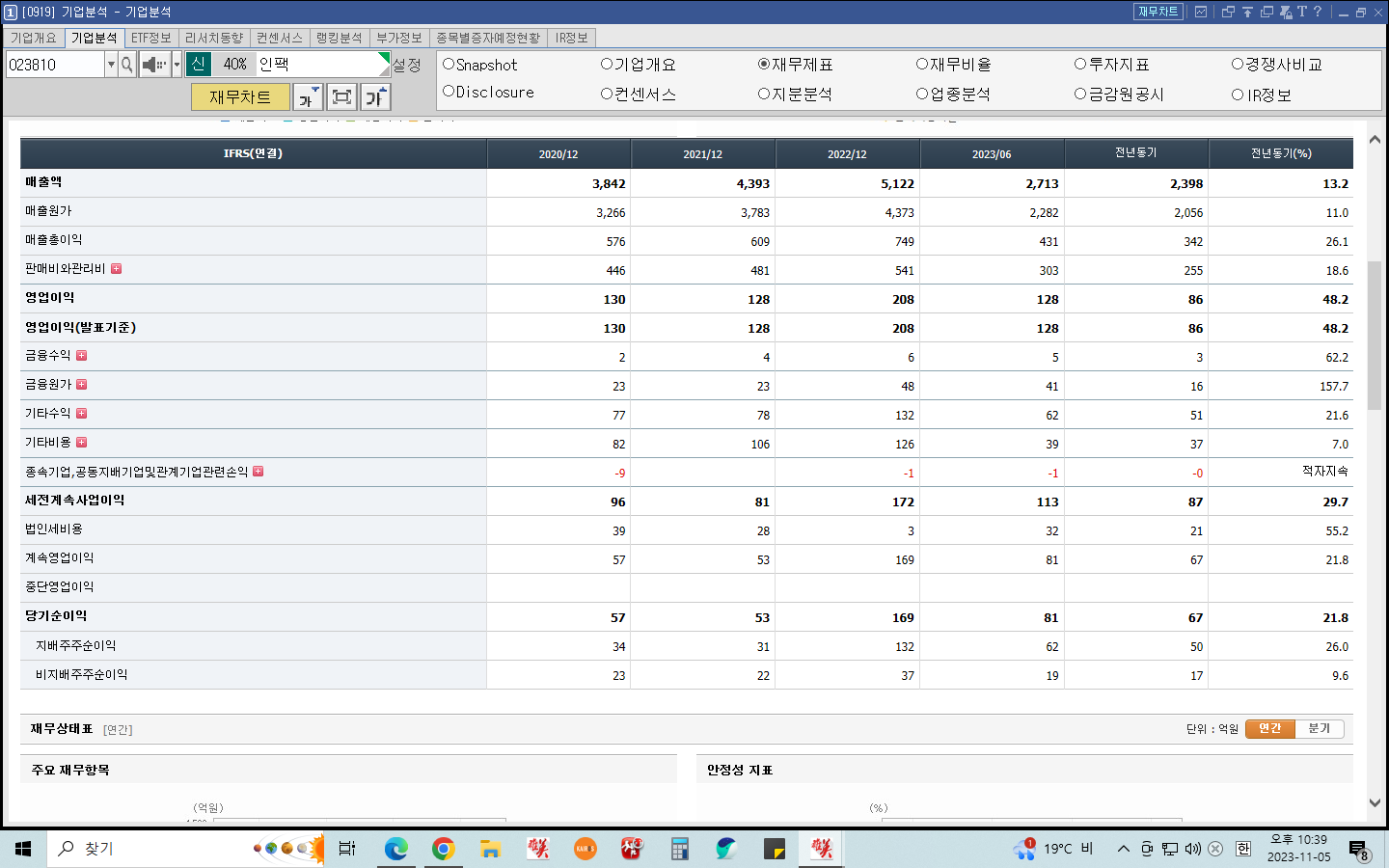 아래 재무제표에서 확인 할 수 있듯이 당반기 연결 매출액은 2,713억 원으로 전년 동기 대비 13.2% 증가했고 당기순이익은 81익 원으로 전년 동기 대비 21.8% 증가했다.