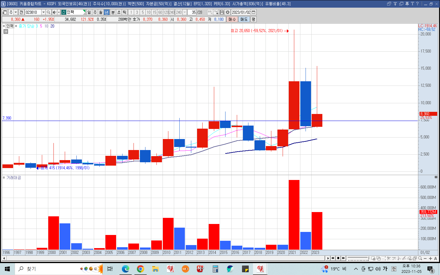 아래 인팩 연봉 차트를 보면 2021년 전고점을 첫 돌파한 기준봉이 형성되었다.