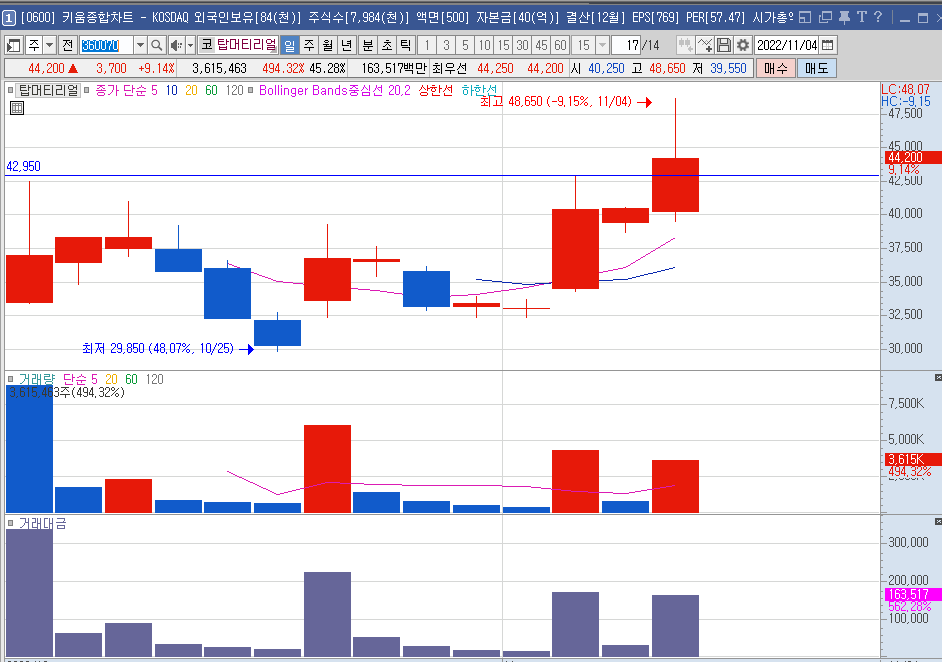 위 일봉 차트에서 보면 알 수 있듯이 상장한 지 얼마 안 된 신규 상장주입니다. 2022년 10월 18일 (화)에 거래 첫날 고가인 42,500원을 2022년 11월 2일 (수)에 거래대금 1,718억 원을 동반해서 돌파 후 하루 조정 이후에 또다시 거래대금 1,635억 원이 터지면서 돌파하였습니다. 탑머티리얼의 시총은 2022년 11월 4일 (금) 기준으로 3,233억 원이며 유동비율은 30.70%입니다.