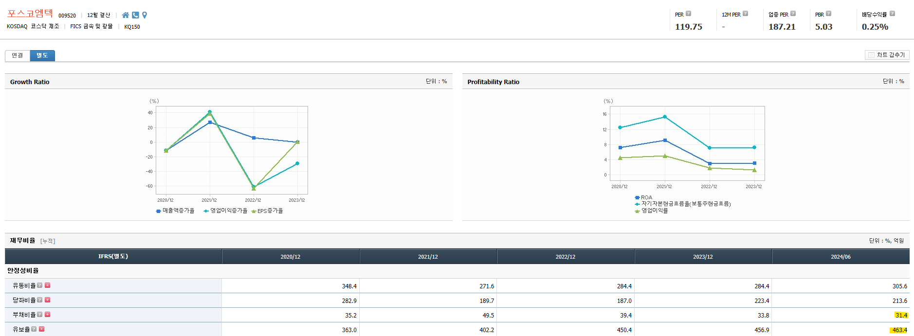 아래 사진을 보면 포스코엠텍의 부채비율은 31.4%, 유보율은 463.4%입니다. 참고로 부채비율은 200% 미만이면 우량기업으로 보고 유보율은 높으면 높을 수록 좋습니다.