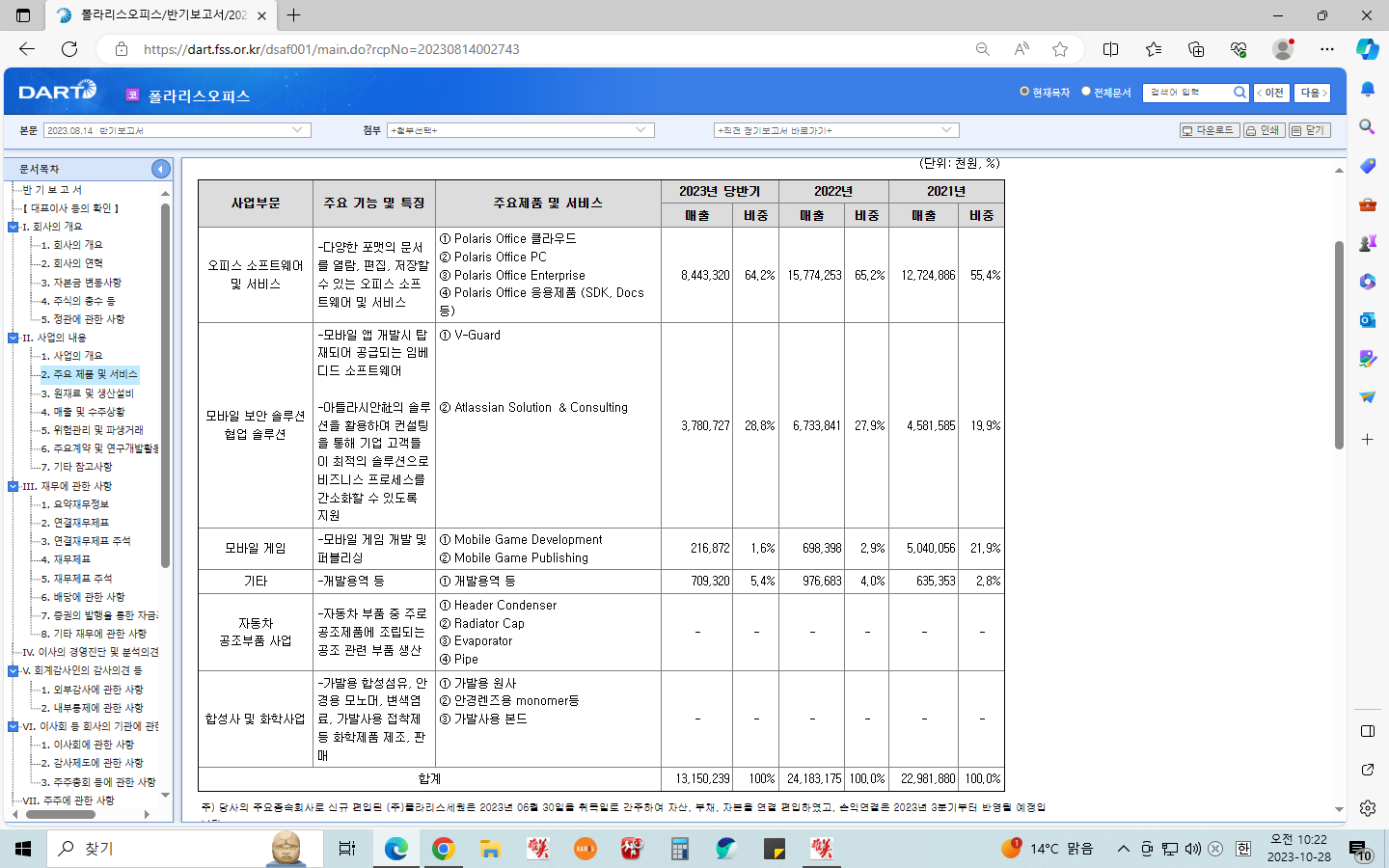 아래 사진에서 폴라리스 오피스의 주요 사업부문과 매출 및 비중을 볼 수 있다.