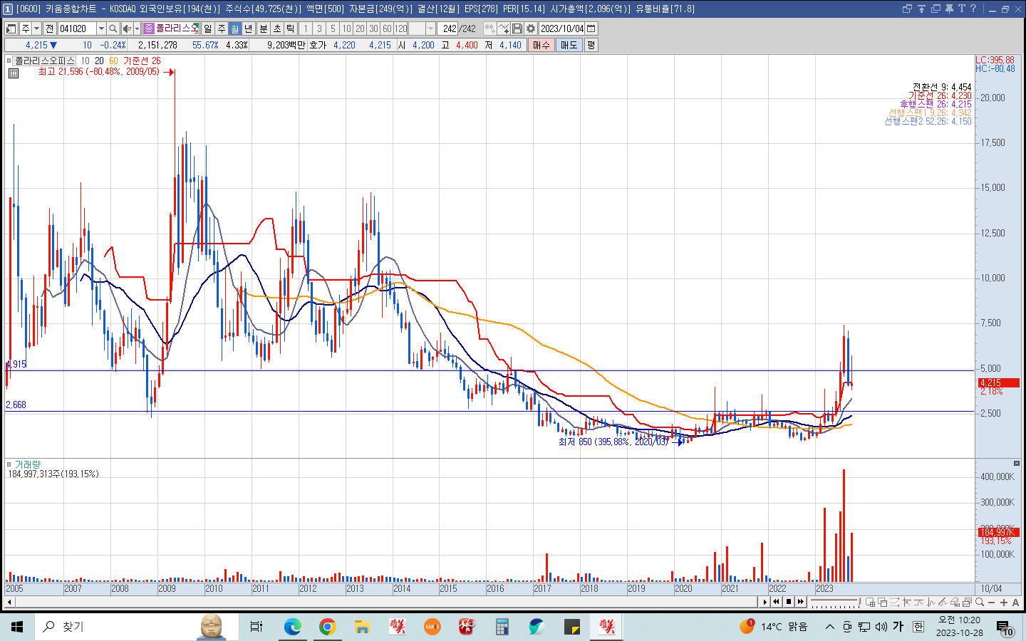 아래 폴라리스오피스 월봉차트를 보면 2023년 6,7,8월 전고점 매물대를 첫 돌파는 기준봉이 발생했다. 또한 월봉 20 이평선 쌍바닥을 만들었다.