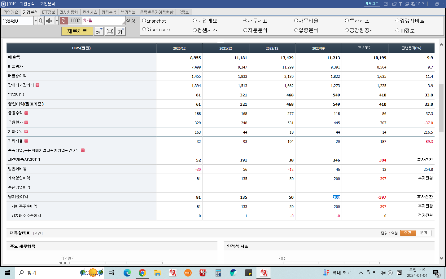 시가총액 대비 당기순이익이 낮으나 전년 동기 대비 약 600억 증가 한걸 볼 수 있다.