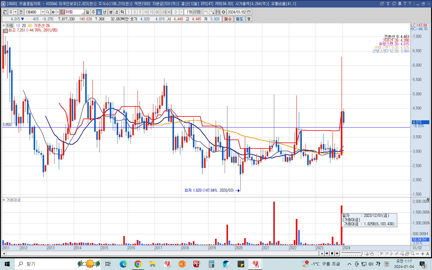 아래 사진은 하림 기업의 주봉 차트이다. 2023년 12월 3번째 주봉을 보면 거래대금 약 1조 4천억 원을 동반하며 3,400원대와 4,000원대의 매물대를 돌파하는 기준봉을 만들었다.