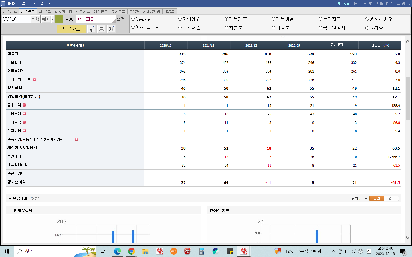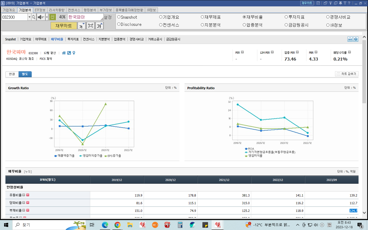 아래 한국파마의 PBR(주가 순자산비율)을 보면 4.33으로 순자산 대비 시가총액이 높은걸 확인할 수 있다.