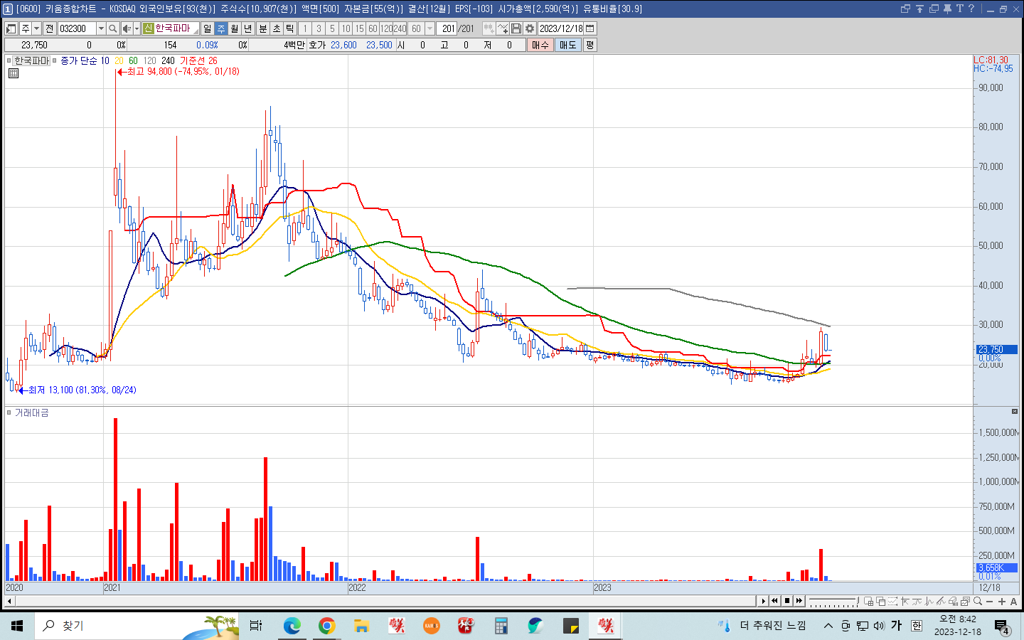 한국파마의 주가가 2023년 10월 중순 부터 상승 추세를 보이고 있다. 하지만 순자산 대비 시가총액이 높고 부채비율도 다소 높은 편이므로 큰 비중으로 매수하기에는 부담스럽다. 또한 유동주식 수가 적기 때문에 변동성도 큰 편이다. 1차 매수는 23,000원 아래에서 하고 2차 매수는 22,000원 아래에서 한다. 평단에서 10% 수익에 자동 매도 걸어 놓는다. 가장 중요한 것은 총자산의 10% 미만으로 투자금을 정하고 그 투자금 안에서 분할로 매수한다.