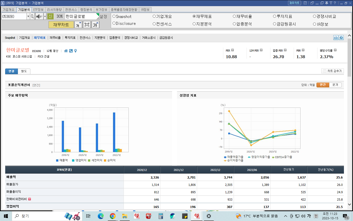 아래 재무제표를 보면 매출액이 증가하고 있고 2023년 상반기 매출은 전년동기 25.6% 증가했다.