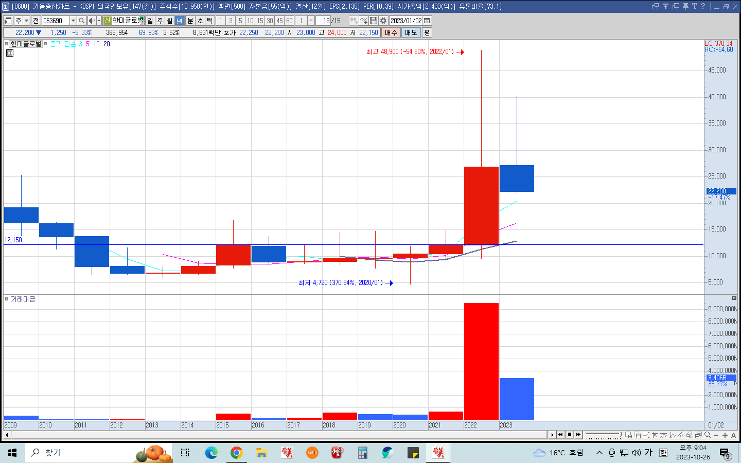 아래 한미글로벌 연봉차트를 보면 전고점 매물대를 첫 돌파하는 2022년 기준봉 발생 이후 조정을 받고 있다.