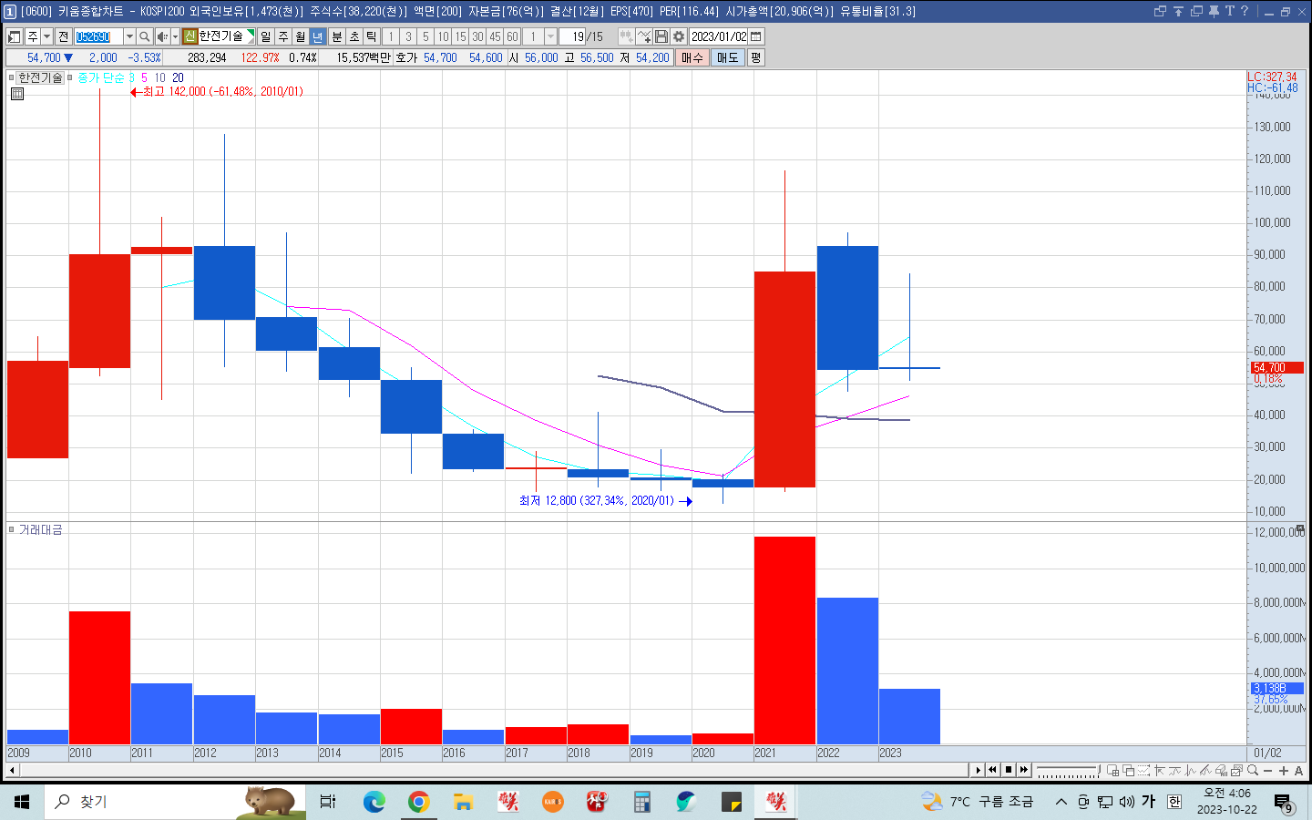 한전기술의 연봉 차트를 보면 10선을 돌파하는 기준봉이 발생했다. 그리고 2년간 조정을 받았다.