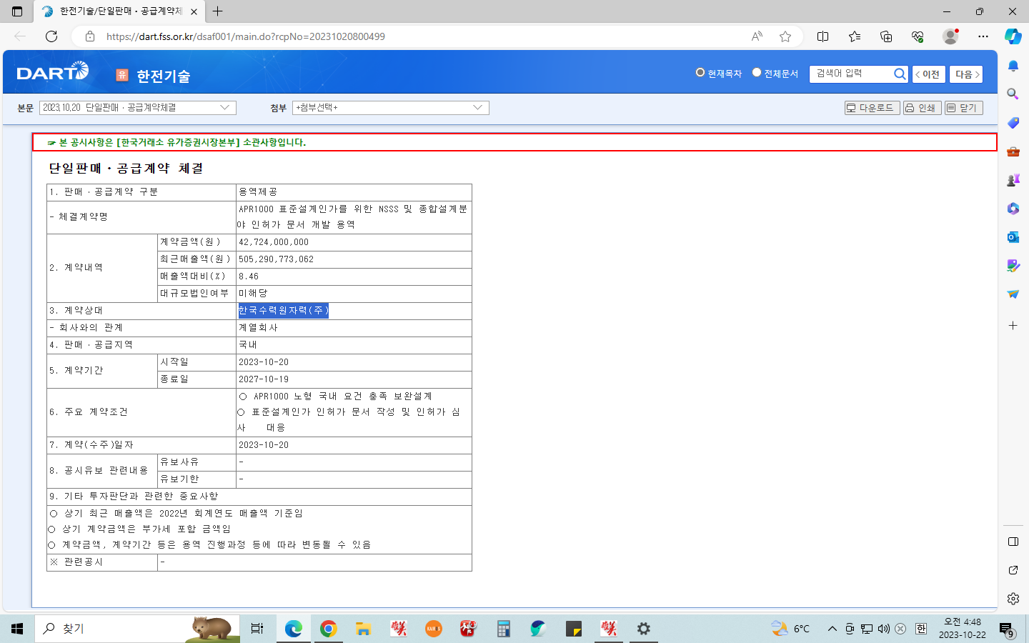 아래 사진에서 볼 수 있듯이 2023년 10월 20일 한전기술이 한수원(한국수력원자력)과 약 427억 원의 단일판매, 공급계약이 체결 되었다. 즉 한전기술은 한수원의 수주와 매출 증대에 연관이 있다.