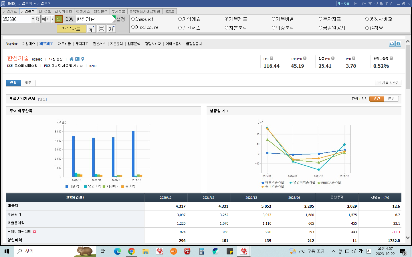아래 재무제표를 보면 2020년 이후 매출이 늘어나고 있는 추세이다. 또한 2023년 6월 영업이익은 전년동기 대비 1782% 상승했다. 하지만 PBR을 보면 시가총액이 높은걸 알 수 있고 PER 116.44로 시가총액 대비 당기순이익이 낮은 걸 알 수 있다.