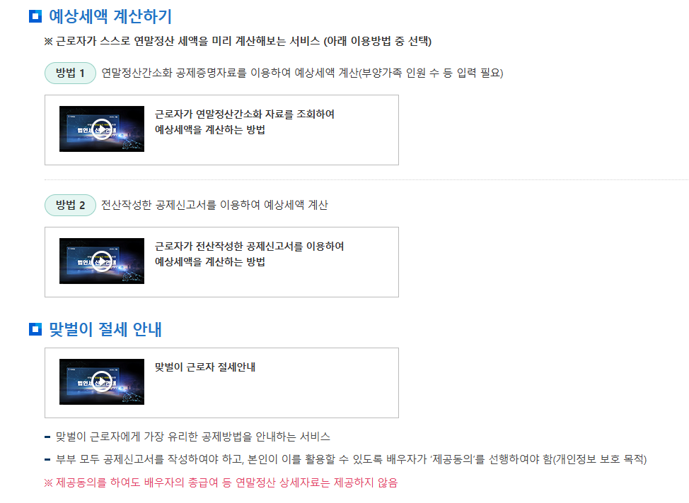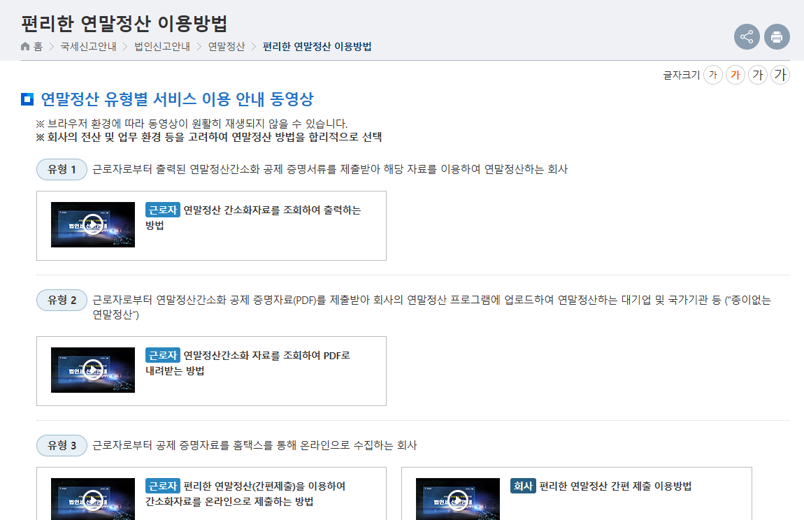 아래 버튼을 누르시면 국세청에서 제공하는 연말정산 유형별 서비스 이용 안내 동영상을 보실 수 있습니다.