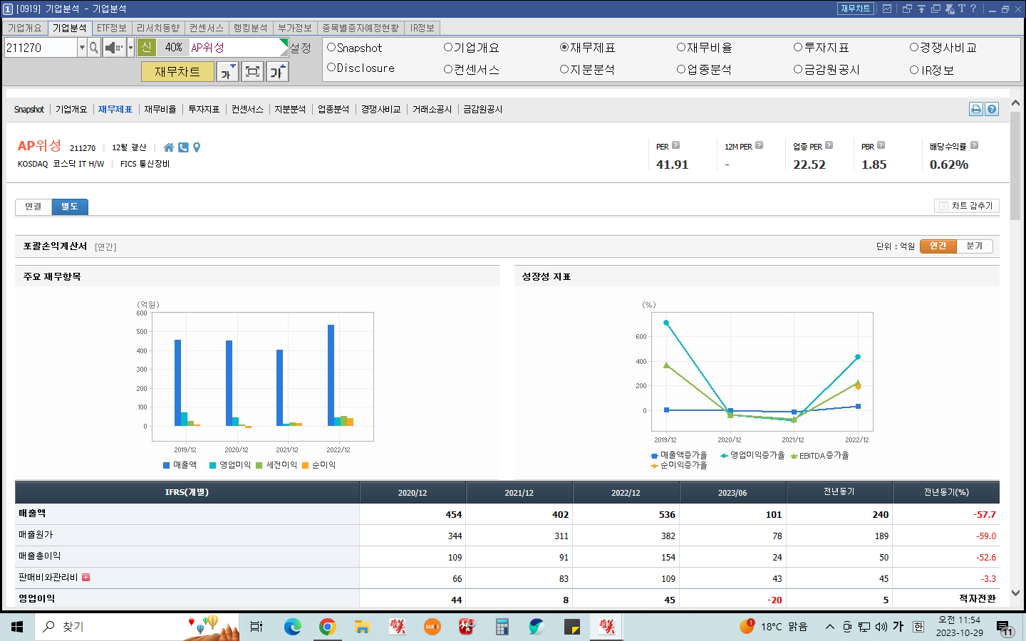 아래에 AP위성의 재무제표를 보면 2023년 6월 영업이익이 적자전환 한 것을 볼 수 있다. 하지만 2023년 7월 28일 약65억 원의 계약체결, 2023년 8월 16일 약 65억 원의 계약체결, 2023년 9월 11일 약 172억 원의 계약체결, 2023년 9월 21일 약 68억 원의 계약체결, 2023년 9월 26일 약 79억 원의 계약 체결 등 연이어 계약체결이 있다. 따라서 앞으로의 실적이 향상될 것으로 보인다.